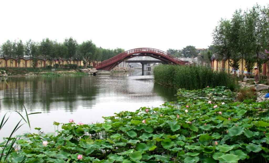 该段水系具有重要的文化内涵,市井文化是这一时期的典型代表。我国最早的商业街出现在宋朝,市井经济的繁荣又随着《清明上河图》而闻名于天下。该段设计突出水系的自然风韵,注重植物的细致搭配,点缀精美的仿古建筑,体现深厚的文化内涵。对水系周边的园林景观、植物配置及建筑等进行整体设计和风格优化,突出重点、加强亮点、提高群点,形成开封市一道移动着的靓丽风景线。从植物景观的角度,分四园为题:春花园、夏荫园、秋韵园、冬凝园;韵四种意境:桃露春浓、荷云夏净、桂风秋馥、梅雪冬妍。展现出“春花、夏绿、秋色、冬姿”的优美景观,随着四季的更迭与交替呈现出特色鲜明的景象与色彩。